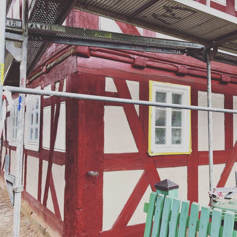 November 2018 Seht her... Das Häusle hat wieder Farbe bekommen. Alle Gefache sind mit dem Unterputz bearbeitet und die Balken wurden mit Leinölfarbe 3 mal rot gestrichen. 3 x hoch!