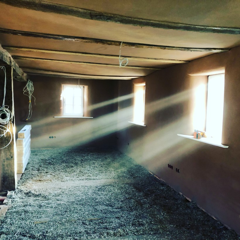 Manchmal beschert einem auch eine dreckige, staubige Baustelle romantische Momente. Seht euch diesen wunderschönen Lichteinfall an. Verursacht durch den Staub der LS200 Hanf-Leichtlehmschüttung.