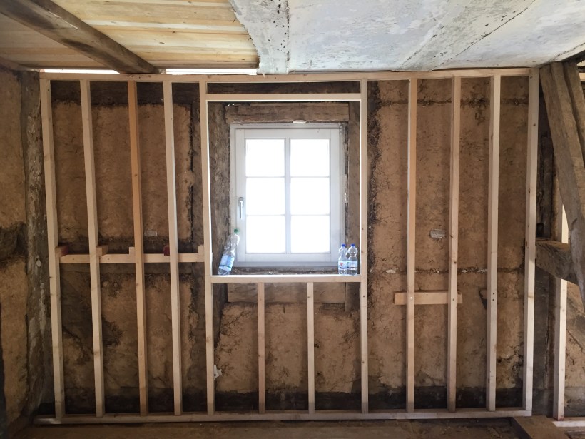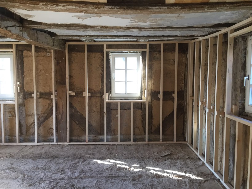 Wir haben uns für eine feuchte Leichtlehm-Dämmung entschieden. Hier stellt man eine Ständerwand im Durchschnitt 12cm von der Außenwand entfernt, in jeweils 30cm Schritten auf. Gebaut aus 6x4cm Latten aus Kiefernholz und Edelstahl-Schrauben, die sich durch die Restfeuchte des Holzes nicht zersetzten. Die neue Dämm-Ebene begradigt zu dem die Außenwände. Praktisch. Das Haus wird langsam GERADE.