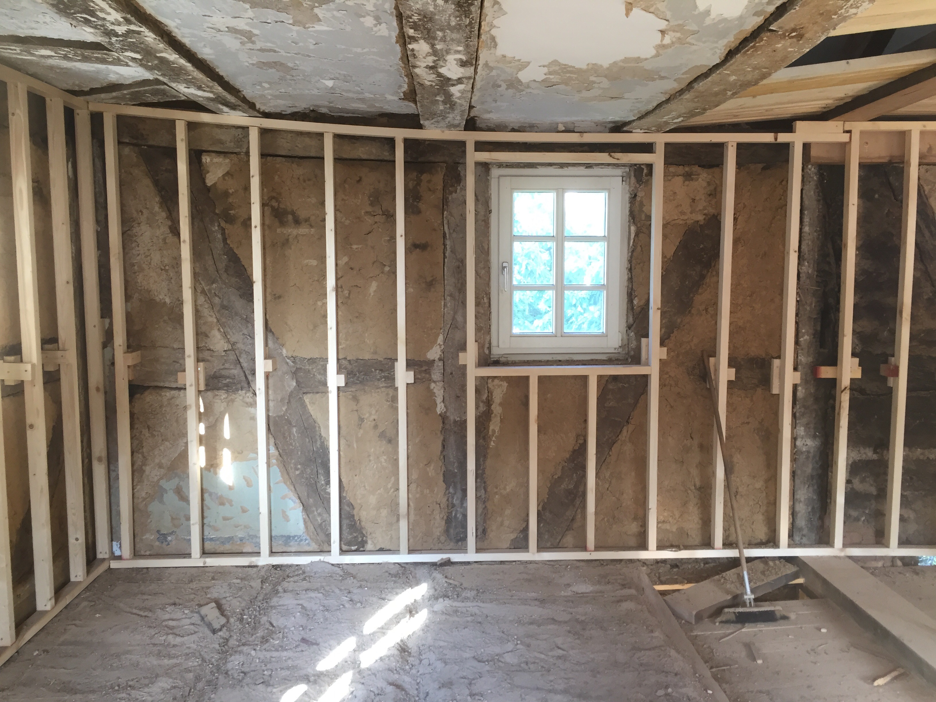 Wir haben uns für eine feuchte Leichtlehm-Dämmung entschieden. Hier stellt man eine Ständerwand im Durchschnitt 12cm von der Außenwand entfernt, in jeweils 30cm Schritten auf. Gebaut aus 6x4cm Latten aus Kiefernholz und Edelstahl-Schrauben, die sich durch die Restfeuchte des Holzes nicht zersetzten. Die neue Dämm-Ebene begradigt zu dem die Außenwände. Praktisch. Das Haus wird langsam GERADE.