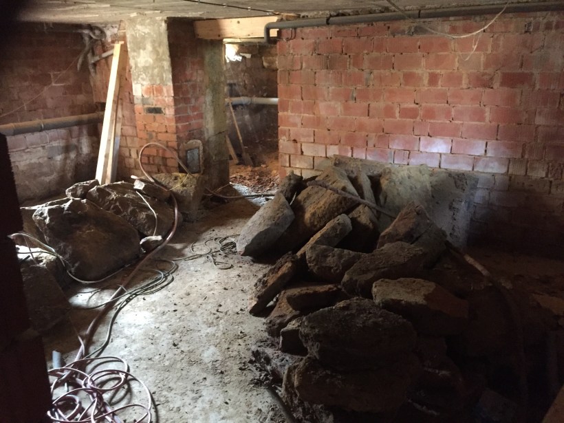 Der Kellerraum vor dem Betroffenen: Hier liegen noch die Sandsteine bereit zur Bergung. Diese Platten bildeten den vorherigen Kellerboden.