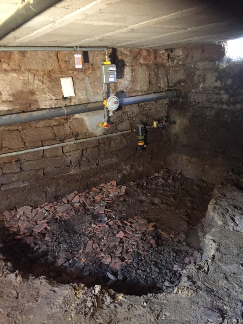 Und diese benötigt natürlich ein Fundament. Unser Kellerboden besteht leider aus Sandsteinplatten, viel Lehmmatsch und Wasser Wasser Wasser Wasser Wasser….