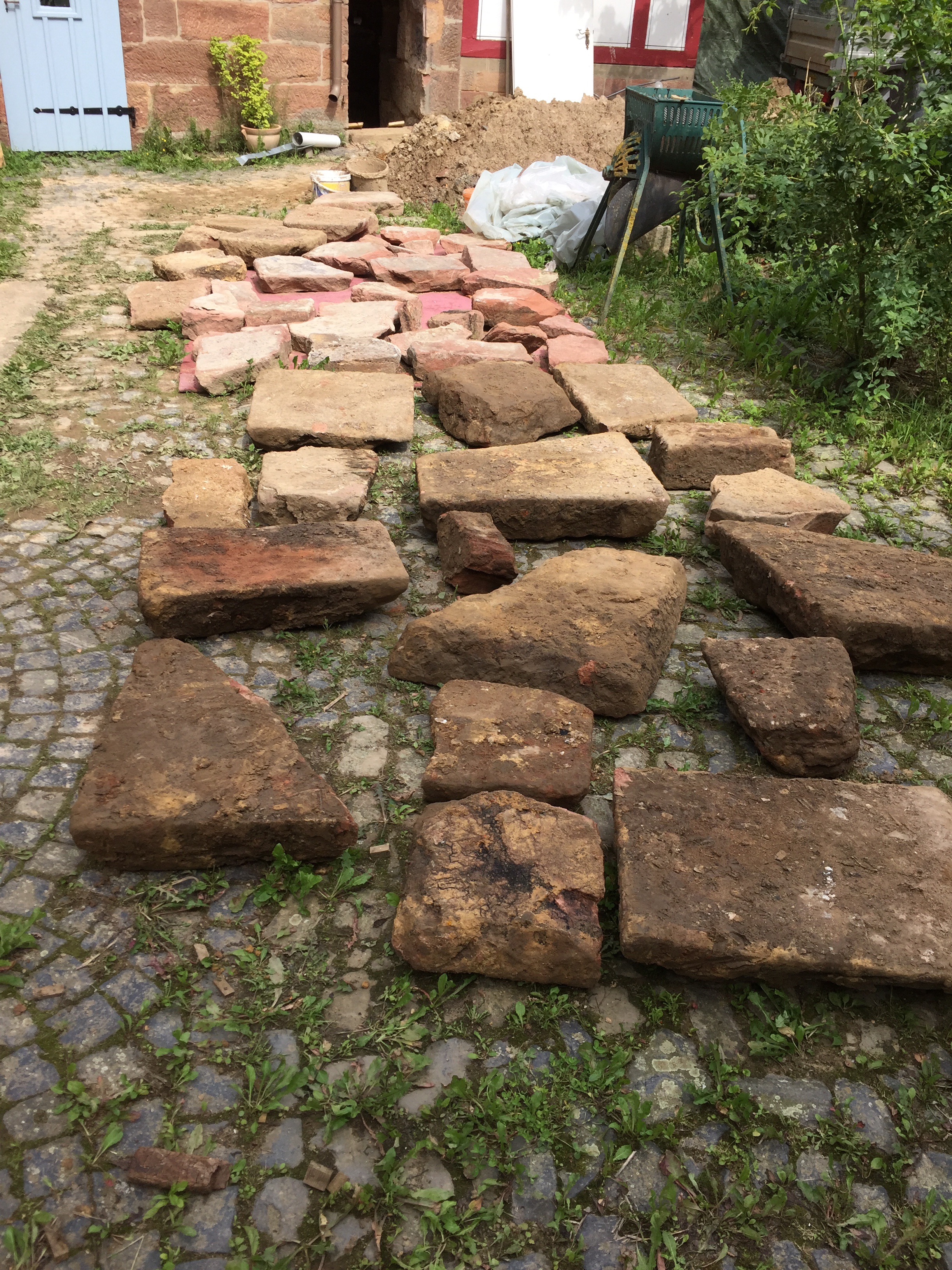 Diese Sandsteinplatten waren Bestandteile des Kellerbodens. Diese mussten zuerst gehoben und aus dem Keller geschafft werden mit Hilfe einer Schwerlast-Sackkarre und zwei starken Männern. Da bei uns alles Wiederverwendung findet, seht ihr auf diesem Foto unsere zukünftige Terrasse. Irgendeinen Sinn muss diese Aktion ja haben.