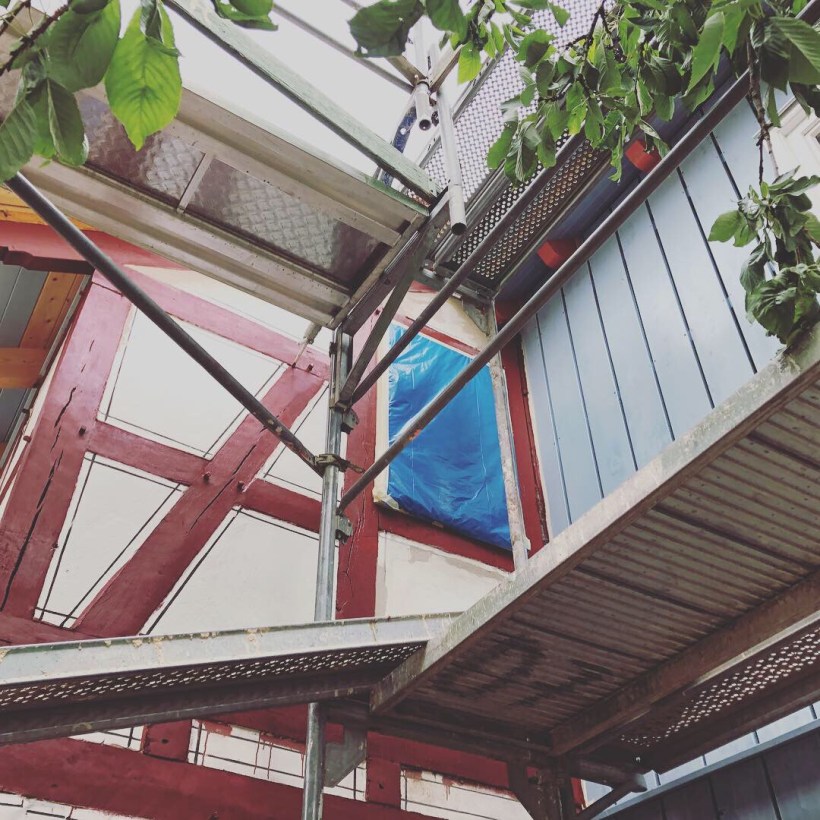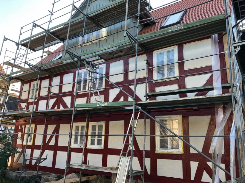 Seht her… Das Häusle hat wieder Farbe bekommen. Alle Gefache sind mit dem Unterputz bearbeitet und die Balken wurden mit Leinölfarbe 3 mal rot gestrichen.